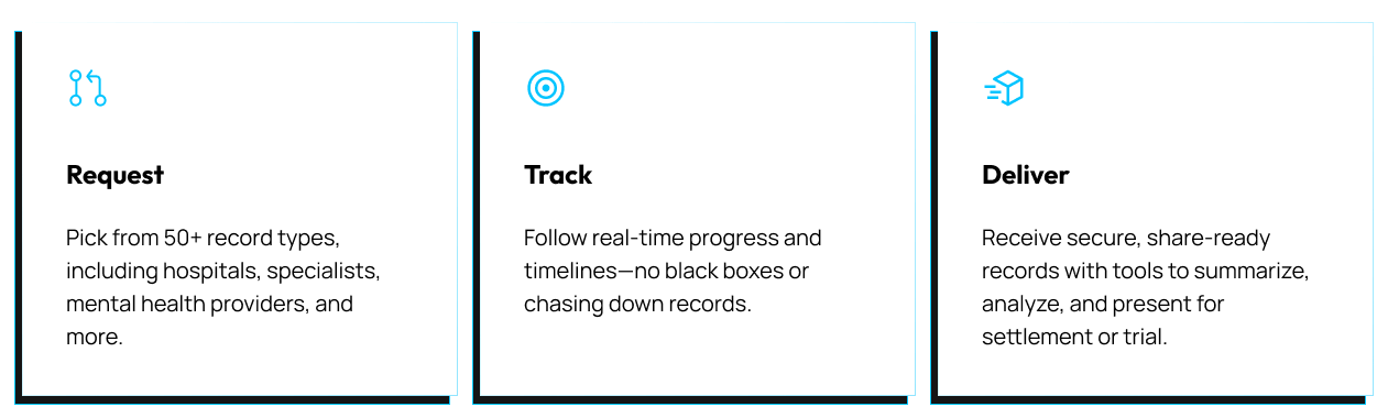 With a Nationwide average turnaround of under 15 days, build your medical records evidence efficiently with less than 1 minute of effort on your part. -