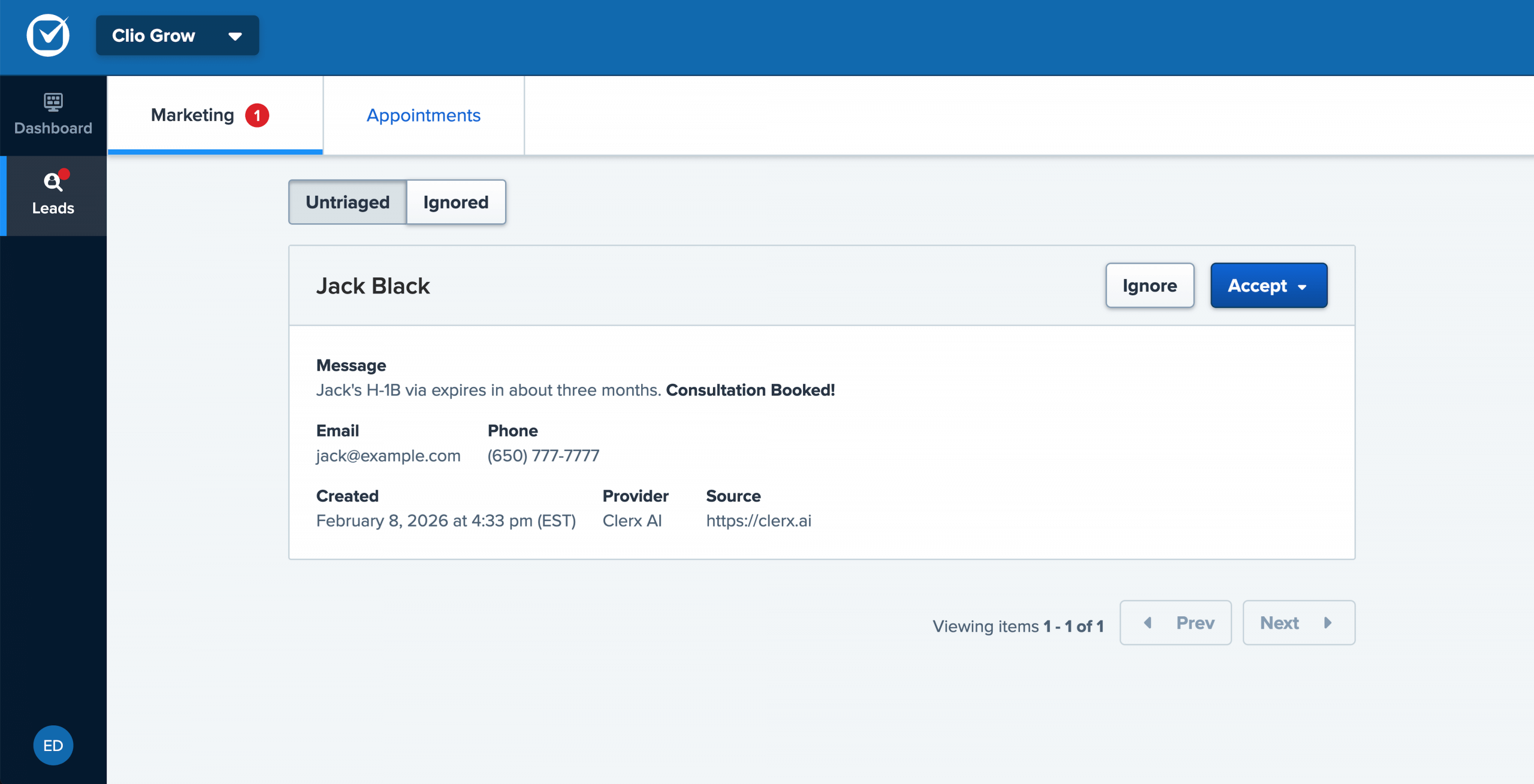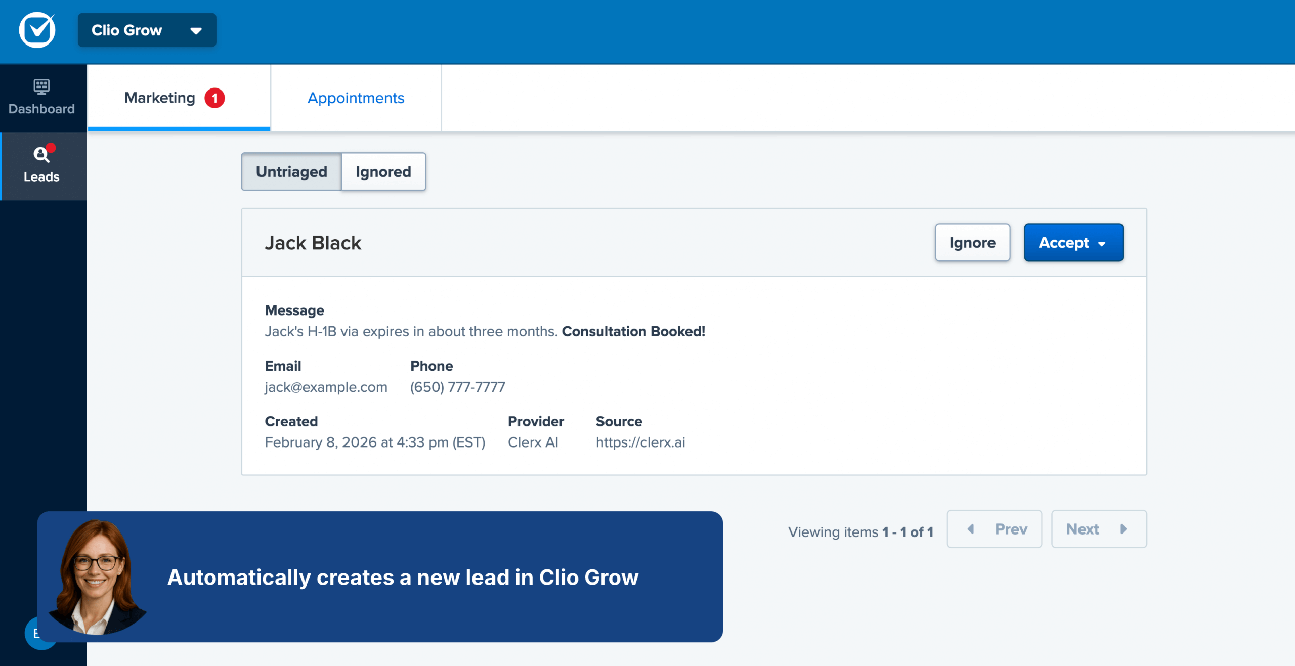 New prospects are automatically added to your Clio Grow Inbox with contact details and call notes, ready for your intake team to review and convert.