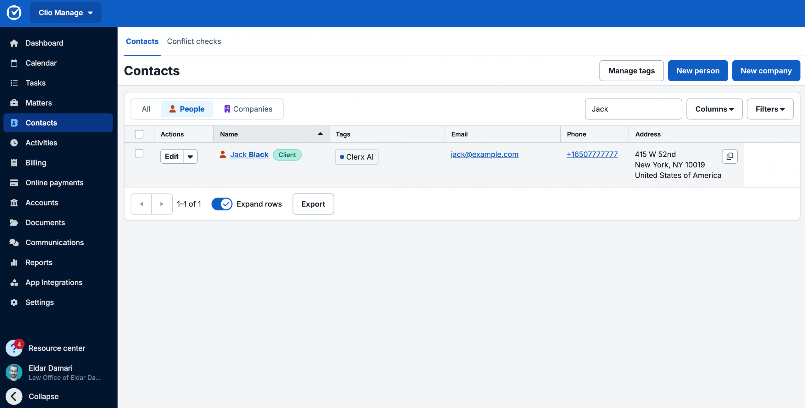 When a call ends, Clerx automatically creates a communication entry in Clio Manage with the caller’s information full call summary. Calls are matched to existing contacts by phone number, or new contacts are created for unknown callers – no manual data entry required. -