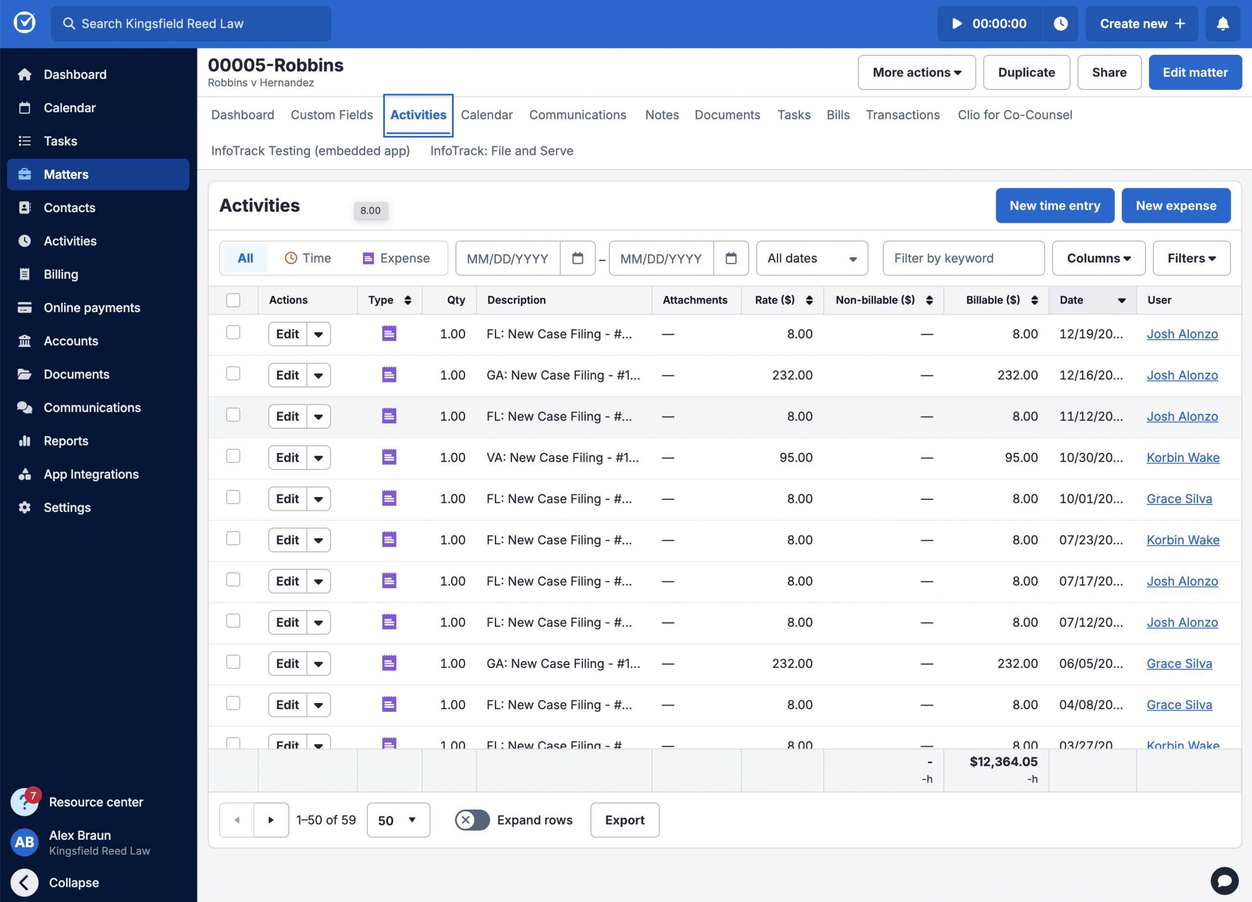Synced to your Clio matter. Filing and service status, court-stamped copies, proofs of service, new docket entries, hearing dates, and expenses all return to your Clio matter. One audit trail. One billing export.