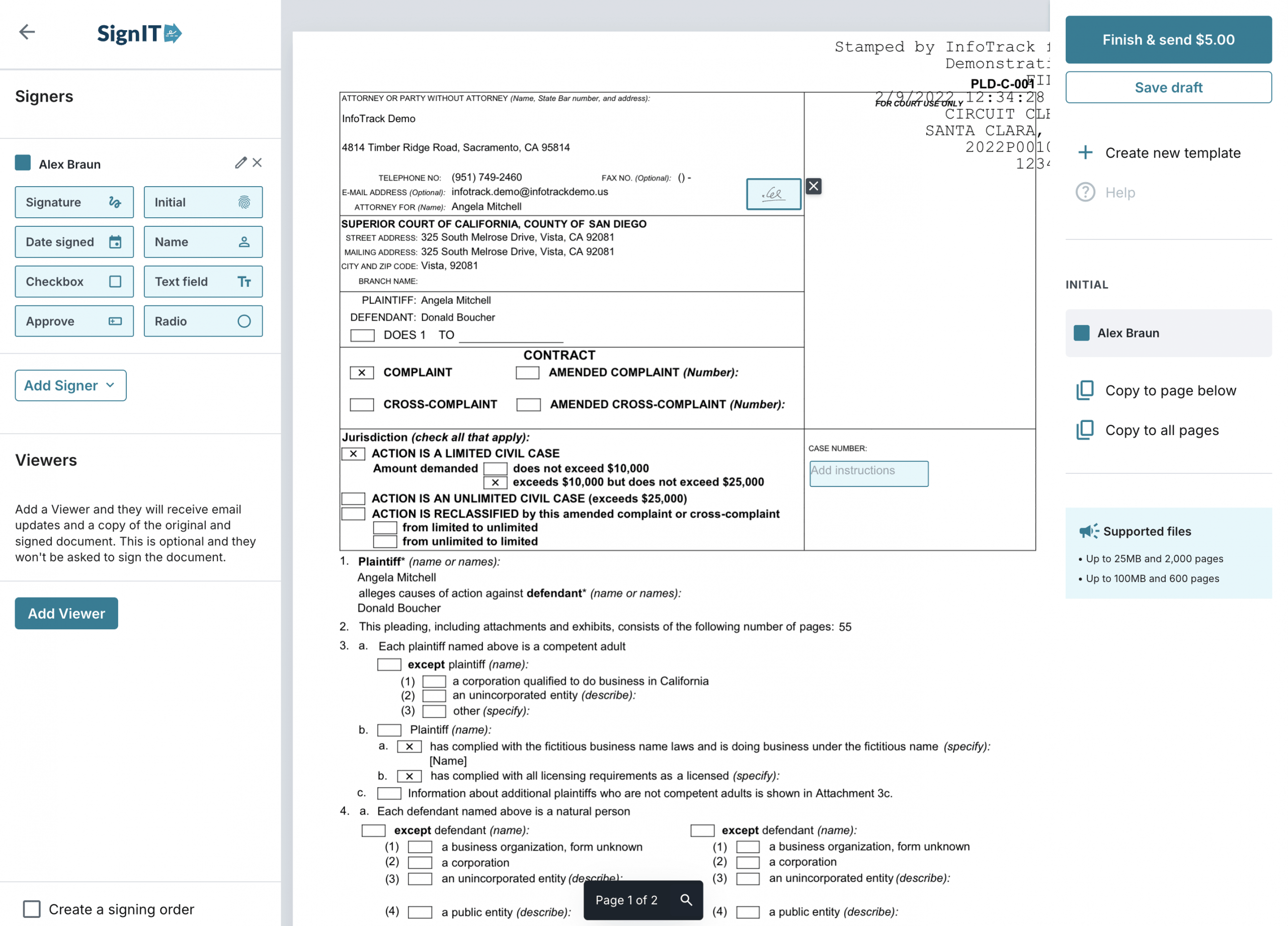 Your documents are already in your Clio Manage matter. InfoTrack pulls them in — reads them, automatically fills the filing, and validates against each court’s rules before submission. Rejections drop 50% below the industry average. File-stamped copies, status, and expenses all sync back to your matter automatically. -