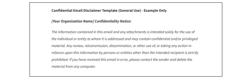 This helps recipients understand what they should keep private and protects your organization from unintentional disclosures. For example, a disclaimer may specify that financial data, trade secrets, or personal identifiable information should be treated as confidential.