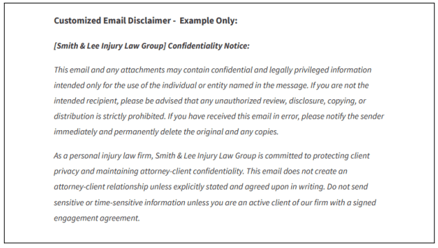 Different industries and legal practice areas often require customized email disclaimer language. For instance, a healthcare law firm may need to include HIPAA-related privacy statements, while a personal injury firm might focus on attorney-client privilege. To ensure compliance and accuracy, it’s best to consult with legal professionals or industry experts when drafting or updating your disclaimer.