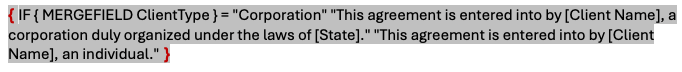 { IF { MERGEFIELD ClientType } = “Corporation” “This agreement is entered into by [Client Name], a corporation duly organized under the laws of [State].” “This agreement is entered into by [Client Name], an individual.” }