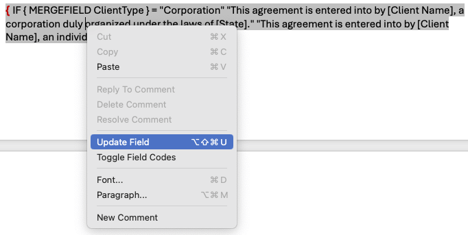 Once your field code is written, right-click anywhere inside the field code and select Update Field. Then, to preview how the conditional output will look in the document, use the keyboard shortcut Option + F9 to toggle between field code view and the rendered document view.