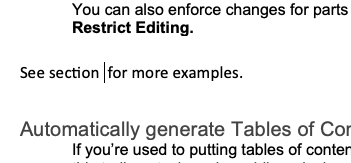 For example, if I want to link to a previous section, type in your text, for example, “See section [leave curser here to insert hyperlink] for more examples”, ensuring to leave your curser where you want the hyperlink to appear.