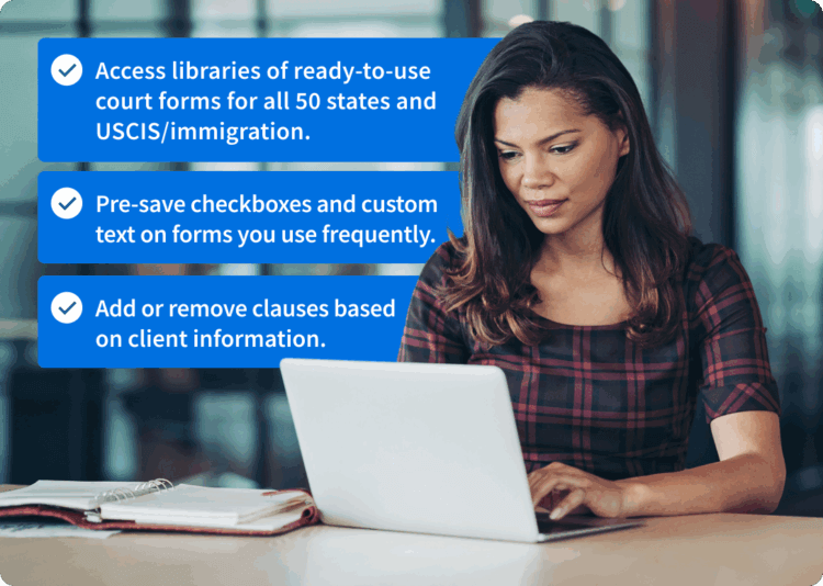 Enter information once and simultaneously populate agreements, correspondence, motions, court forms and more. Save sets of documents to populate packets of documents easily.