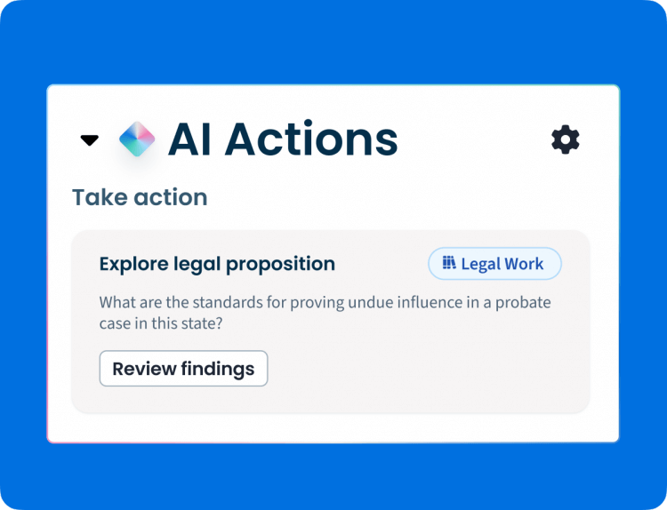 Clio Work interprets, prepares, and acts on what matters. It proactively draws from your documents, deadlines, tasks, notes, and case details already in Clio to surface insights, identify relevant precedent, and deliver precise, legally grounded results.